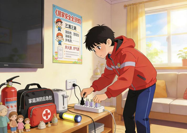 3.家中配备必要的消防器材,并教会孩子正确地使用方法。 开展一次家庭火灾隐患排查,及时清理楼道、阳台堆积的杂物。