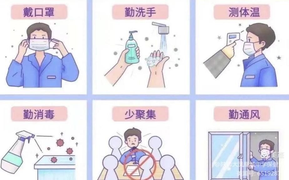 1.勤洗手:饭前便后、外出归来、接触公共物品后,按七步洗手法洗手。