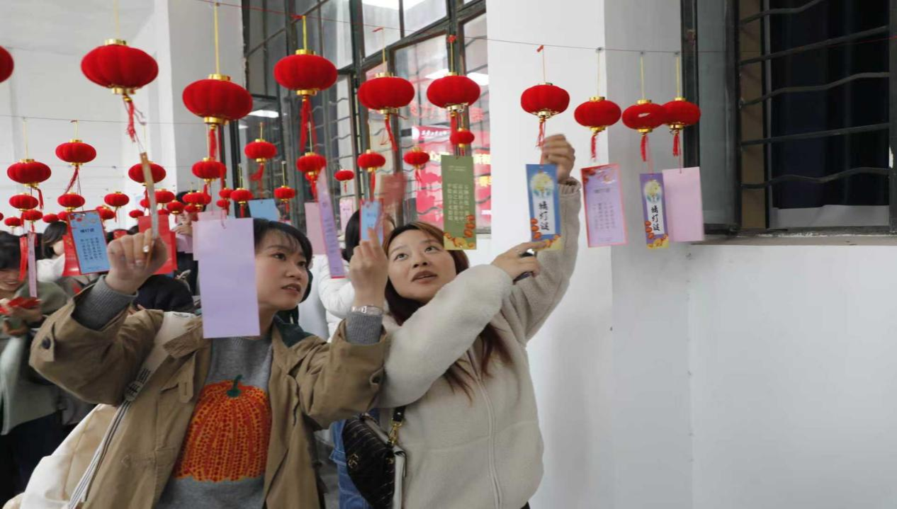 活动当天,现场充满节日氛围:红彤彤的灯笼高悬挂满场地,一张张写满灯谜的字条随风摇曳,女教师们欢聚一堂,笑语盈盈,让每一位到场者都感受到浓浓的暖意,在猜谜益智、互动团圆中共度美好节日。