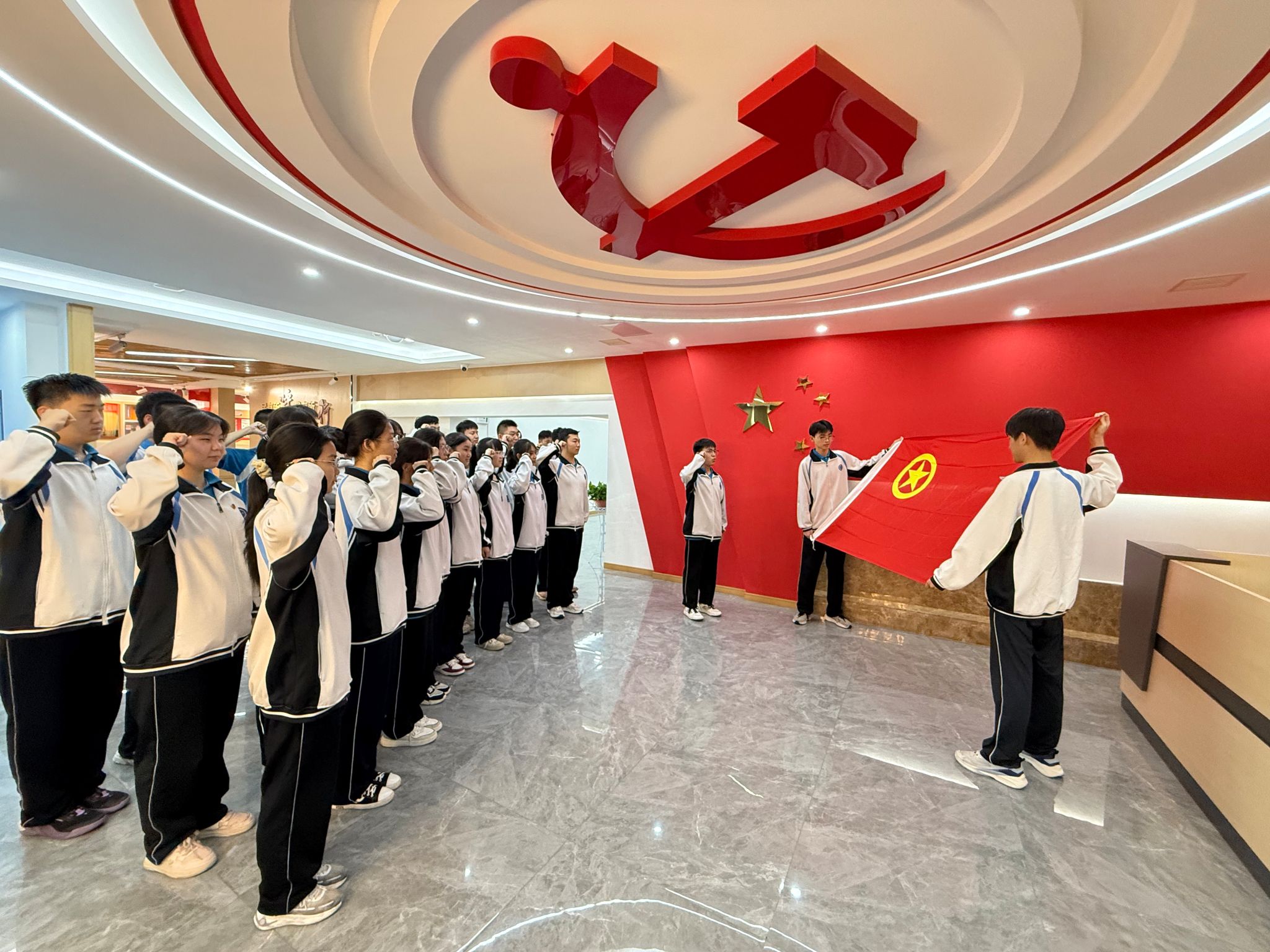 紧接着,在庄严肃穆的氛围中,全体团员青年面向团旗,高举右拳,在领誓人温李思宇同学的带领下,重温入团誓词。铿锵有力的誓言回荡在现场,彰显着附中学子坚定的理想信念和崇高的价值追求。